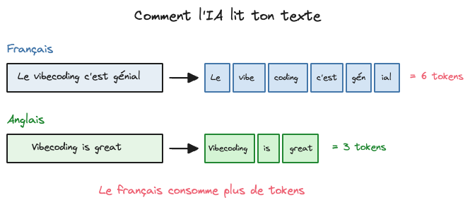 Comme les IA sont majoritairement entraînées sur des bases de données anglaises, elles auront beaucoup plus de mal à reconnaître des mots français. Elles consomment donc beaucoup plus de tokens pour les textes en français. C'est pour ça qu'on va utiliser plus de tokens quand on parle en français à l'IA (donc que ça coûte plus cher). Et l'IA comprend beaucoup mieux quand on lui parle en anglais parce qu'elle reconnaît directement les mots et les concepts, elle n'a pas besoin de les deviner.