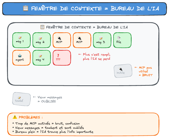 Et les fichiers et nos messages de conversation ne sont pas la seule chose qui remplit cette fenêtre de contexte. Les outils que l'IA a à disposition (MCP, agents, commandes) consomment aussi de la place. Car le simple fait qu'ils existent et que l'IA doit être consciente qu'elle peut les utiliser lui prend de la place.